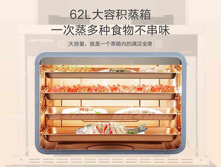 更值得一提的是,科恩智能變頻大吸力X系列集成灶除了擁有較強的油煙吸力外,還擁有5.0KW大火力,猛火直噴爆炒,熱量集中不分散,59銅火蓋設計,安全穩定使用壽命更長。與此同時,下方還搭載了62L黃金容量蒸烤箱,一鍵智能預約,4D立體直噴蒸烤模式,受熱更均勻,頂部不滴水,智能恒溫蒸烤,多種食物蒸烤不串味,美食色澤亮麗,營養不流失,并配備全面高溫蒸消毒功能,讓用戶們的餐具使用更健康更安全!