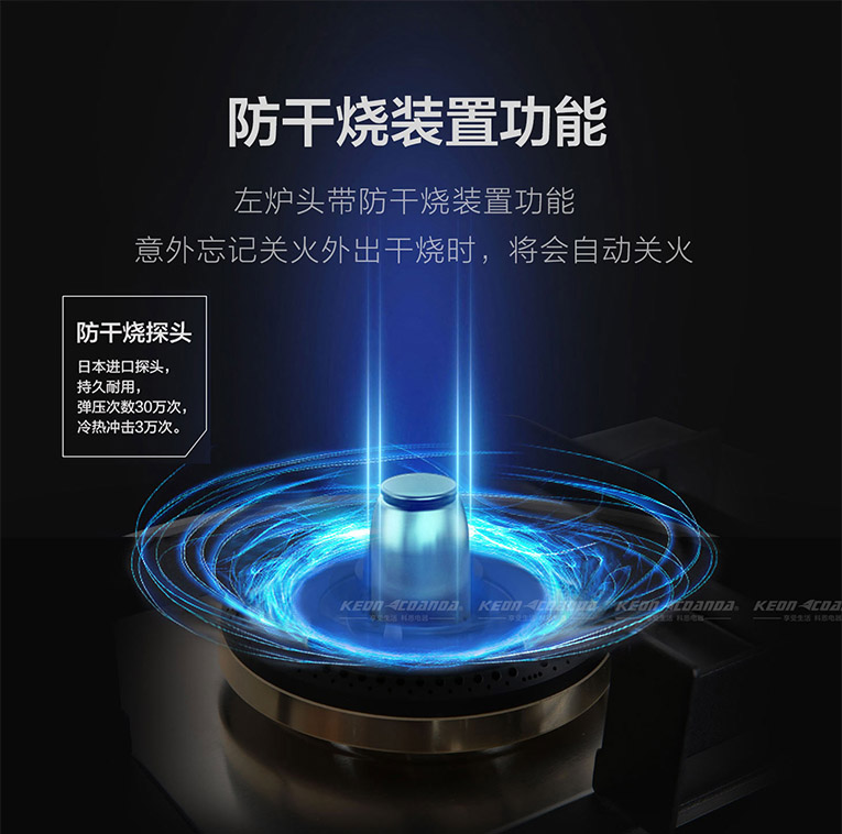 在安全方面,集成灶十大品牌、廚電行業十大品牌科恩KN610燃氣灶還擁有防干燒裝置功能,日本進口探頭設計,意外忘記關火外出干燒時將會自動關火,溫控探頭檢測不到鍋具離鍋60S自動熄火,時刻保衛烹飪安全。