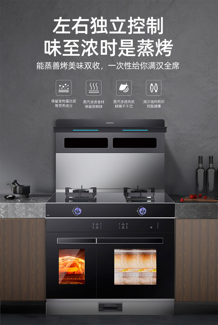 科恩S450左右蒸烤集成灶不僅將集成灶下置空間進行了重新設計,80L大容量整體拉伸內膽設計,30L烤箱容量加50L蒸箱容量,左烤右蒸,同時獨立操作,箱體不串味,烹飪更高效的同時還帶來了更好的烹飪體驗。120℃高溫速蒸,急速加熱,快速出蒸汽,蒸汽底盤迅速產生和分配熱氣,包裹食材,快速鎖鮮,留住營養與纖維;烤箱上下雙加熱系統立體交互,火力均勻外焦里嫩,360°立體燒烤功能,內部熱量均勻分布,讓每層食物都保持高品質烘焙效果,烤出驚艷好味道。