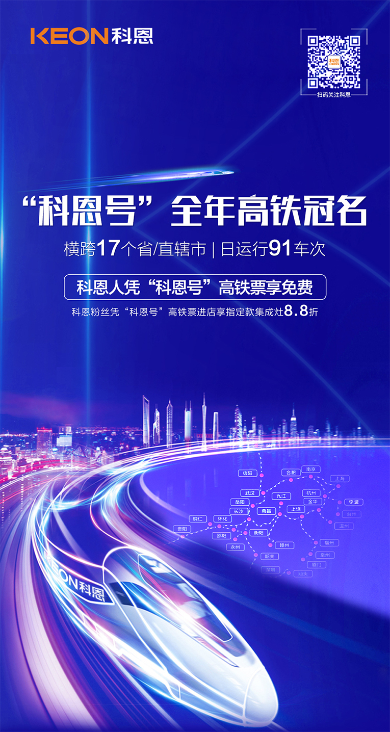 一列列品牌冠名高鐵縱橫馳騁,匯集了來自全國各地人群,產生著強大的品牌引領效應。集成灶十大品牌、廚電行業十大品牌“科恩號”高鐵專列正式運行,橫跨17個省/直轄市,日運行91車次!科恩集成灶啟動全年高鐵冠名,通過中國高鐵完善的平臺搭建,實現渠道共享,與品牌進行無縫嫁接,成功開啟輻射全國的品牌戰略布局,將品牌觸角延伸至高鐵,借助高鐵國家名片屬性為品牌權威背書,傳遞至大江南北,讓“集成灶就選科恩大吸力”口號,借助高鐵速度、廣度以及深度,更精準地推向全國市場!