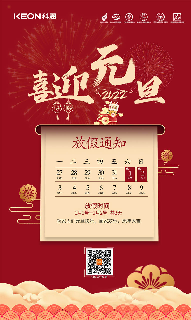 尊敬的全國科恩家人們:元旦將至,根據《國務院辦公廳公布2022年放假安排》,結合公司實際生產情況,科恩總部元旦放假安排通知如下: