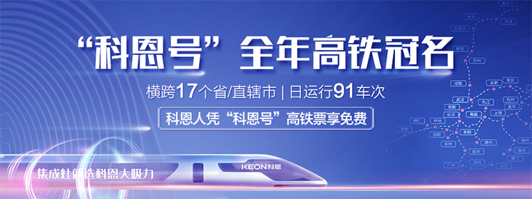 作為集成灶十大品牌、廚電行業(yè)十大品牌的科恩集成灶,杭紹臺(tái)高鐵的建成開(kāi)通,開(kāi)啟了科恩集成灶發(fā)展新篇章。2021年,斥資800萬(wàn),“科恩號(hào)”高鐵品牌專(zhuān)列馳騁大江南北,橫跨17個(gè)省/直轄市,日運(yùn)行91車(chē)次。
