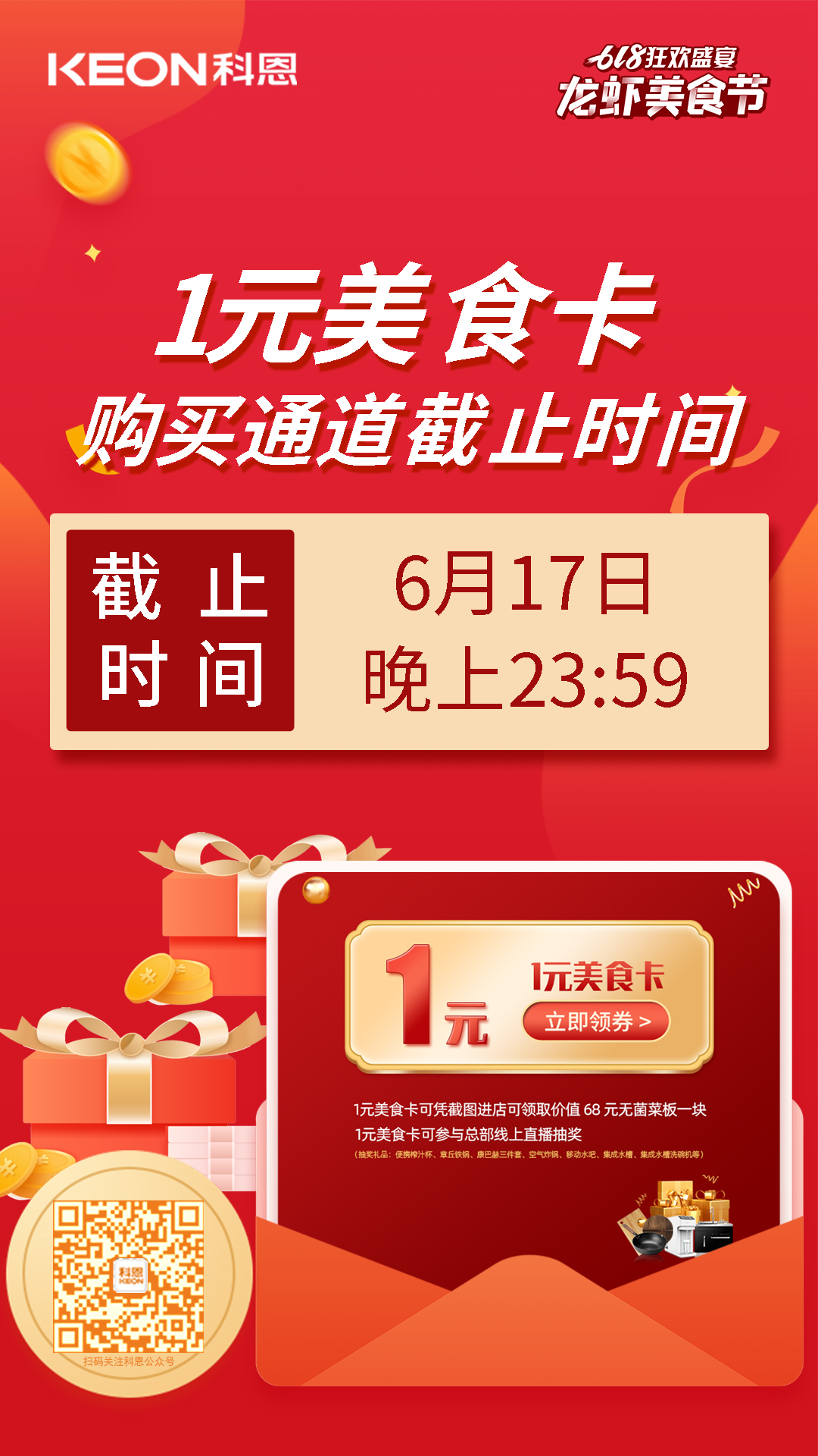 注意!注意!注意!科恩集成灶618狂歡盛宴——龍蝦美食節(jié)將于6月18日14點(diǎn)直播大抽獎(jiǎng)后落下帷幕,1元美食特權(quán)專(zhuān)屬卡權(quán)購(gòu)買(mǎi)通道也將于今晚(6月17日)23:59準(zhǔn)時(shí)關(guān)閉!薅羊毛福利即將進(jìn)入倒計(jì)時(shí)!還沒(méi)有購(gòu)買(mǎi)一元特權(quán)卡的朋友們要抓緊時(shí)間了!話不多說(shuō),最后一次薅羊毛安利,拿走不謝!