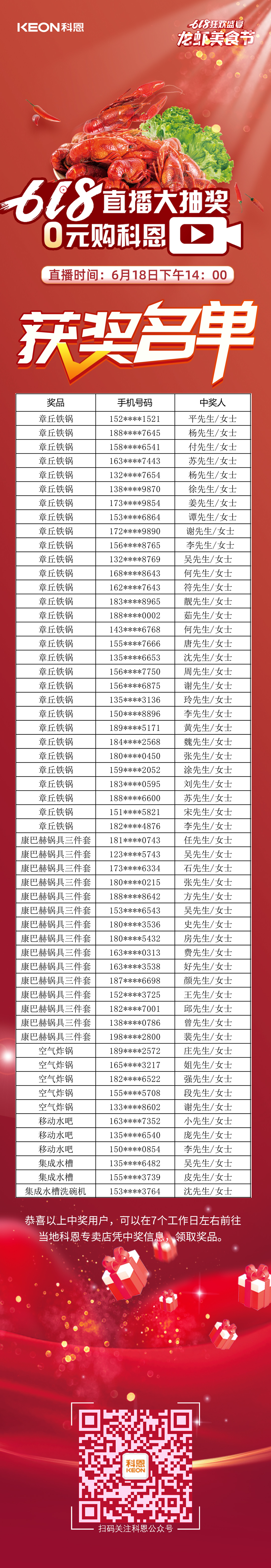 萬人品美食,0元搶科恩——科恩龍蝦美食節(jié)圓滿落幕,千城千店,共襄盛舉,感謝大家對科恩集成灶的大力支持,618直播大抽獎獲獎名單火熱出爐,恭喜以上獲獎的小伙伴們,請盡快聯(lián)系當?shù)?a href="http://m.54906.com.cn/" target="_blank">科恩門店,快把獎品領回家吧!