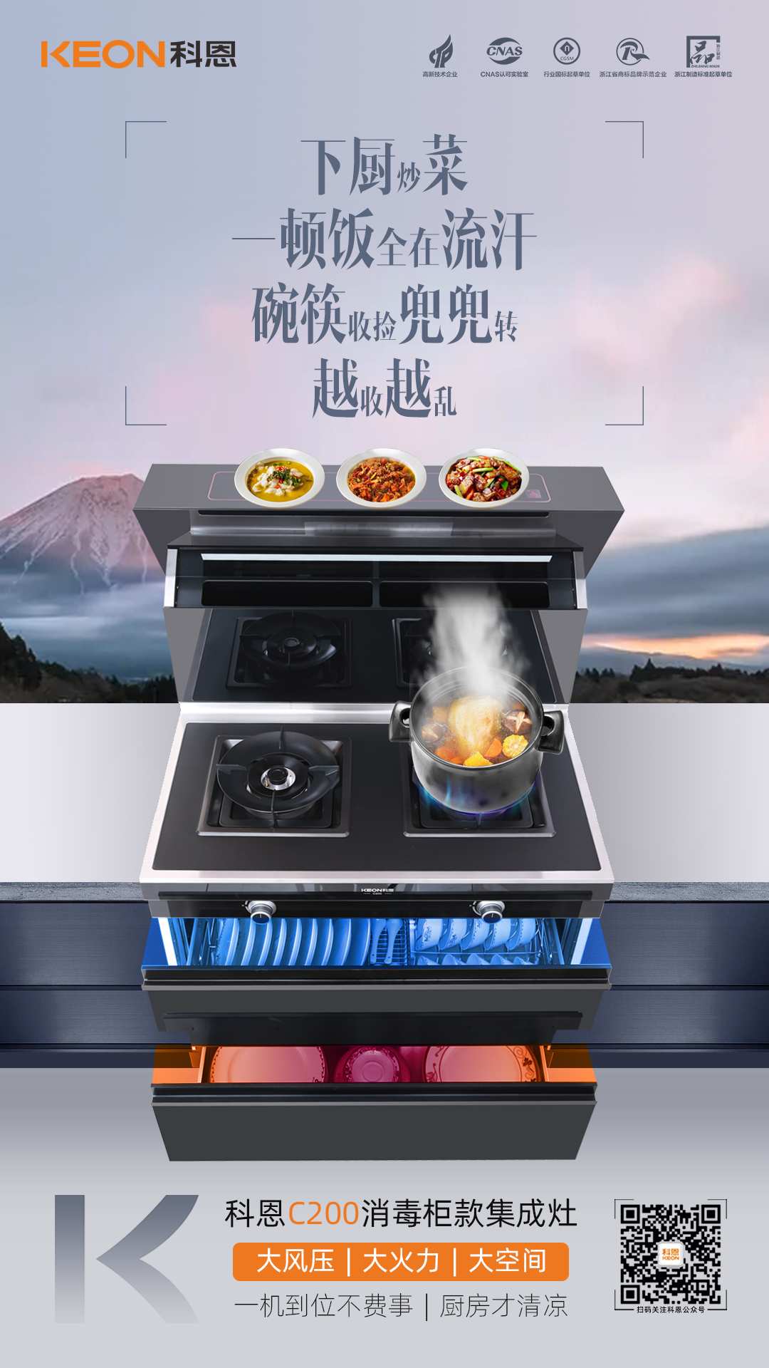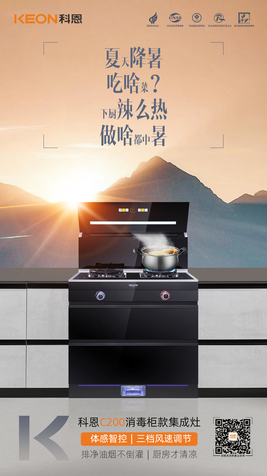 科恩C200消毒柜款集成灶,打破夏季廚房悶熱魔咒!