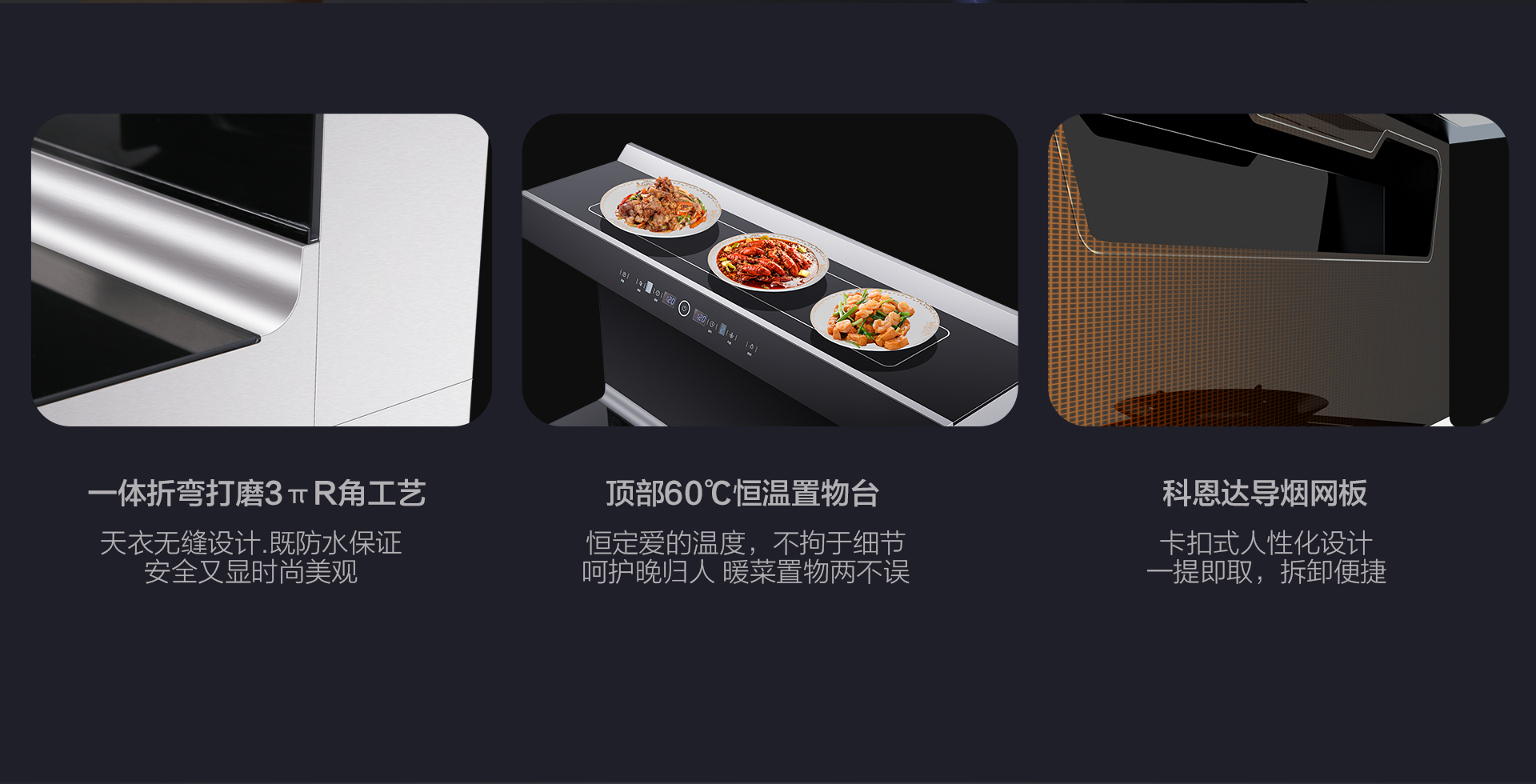 ◆黑晶防爆玻璃臺(tái)面,具備具備高性能防爆特性;機(jī)頭與機(jī)身結(jié)合處采用一體折彎打磨3πR角工藝——天衣無(wú)縫設(shè)計(jì),既能防水保證安全、打理便捷又顯得時(shí)尚美觀;再加上一提即取的科恩達(dá)導(dǎo)煙網(wǎng)板,分分鐘實(shí)現(xiàn)輕松拆卸,使得內(nèi)部清潔打理成為舉手之勞!