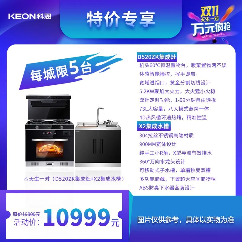 科恩X2集成水槽+D520ZK集成灶,套購(gòu)即享特價(jià)優(yōu)惠,集成智慧廚房萬(wàn)元搬回家