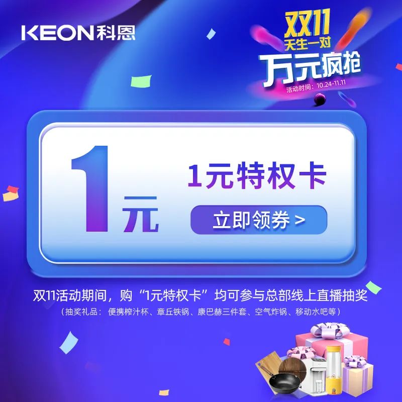 雙十一活動(dòng)期間,凡購(gòu)1元特權(quán)卡即可參與總部線上直播大抽獎(jiǎng),便攜榨汁杯、章丘鐵鍋、康巴赫三件套、空氣炸鍋、移動(dòng)水吧等萬(wàn)元豪禮送不停