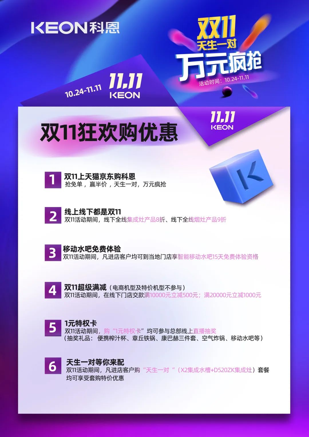10月24日-11月11日,全國(guó)科恩門(mén)店、天貓、京東,三點(diǎn)聯(lián)動(dòng),線上線下都是雙11!