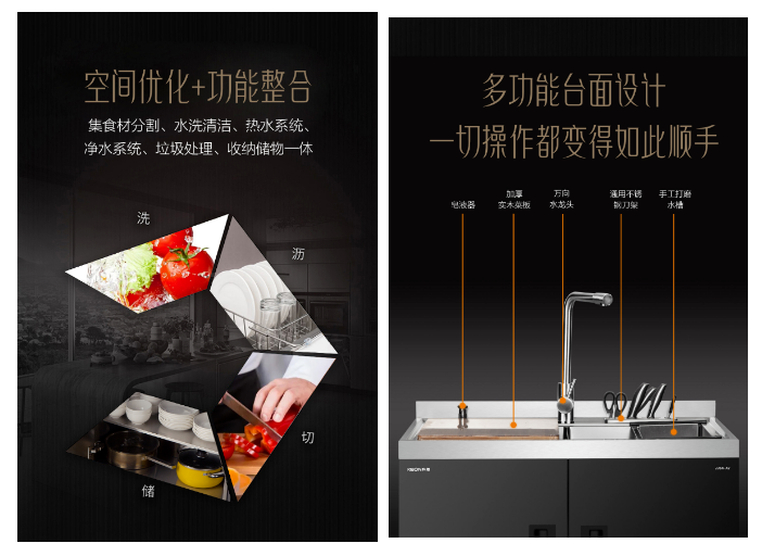 空間優(yōu)化+功能整合,集食材分割、水洗清潔、熱水系統(tǒng)、凈水系統(tǒng)、垃圾處理、收納儲(chǔ)物于一體,多功能臺(tái)面設(shè)計(jì),皂液器、加厚實(shí)木菜板、萬(wàn)向水龍頭、通用不銹鋼刀架、手工打磨水槽等功能,每一處細(xì)節(jié)堪稱(chēng)完美,整體造型優(yōu)美別致,同時(shí)兼顧實(shí)用性。
