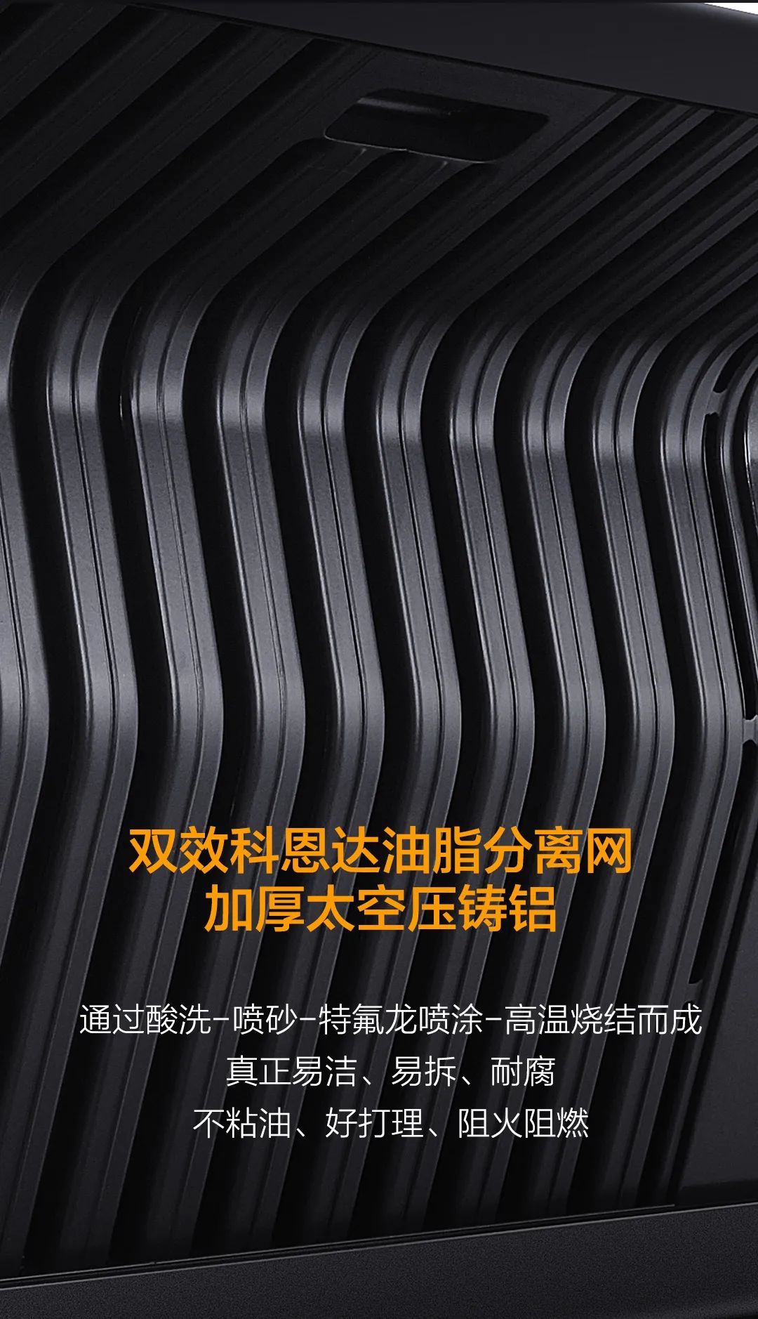 在工藝上經(jīng)過酸洗-噴砂工藝加之特氟龍噴涂最后高溫?zé)Y(jié),不僅不沾油、易清潔好打理。在分離油煙的同時(shí),還能阻燃阻熱!保障廚房安全!