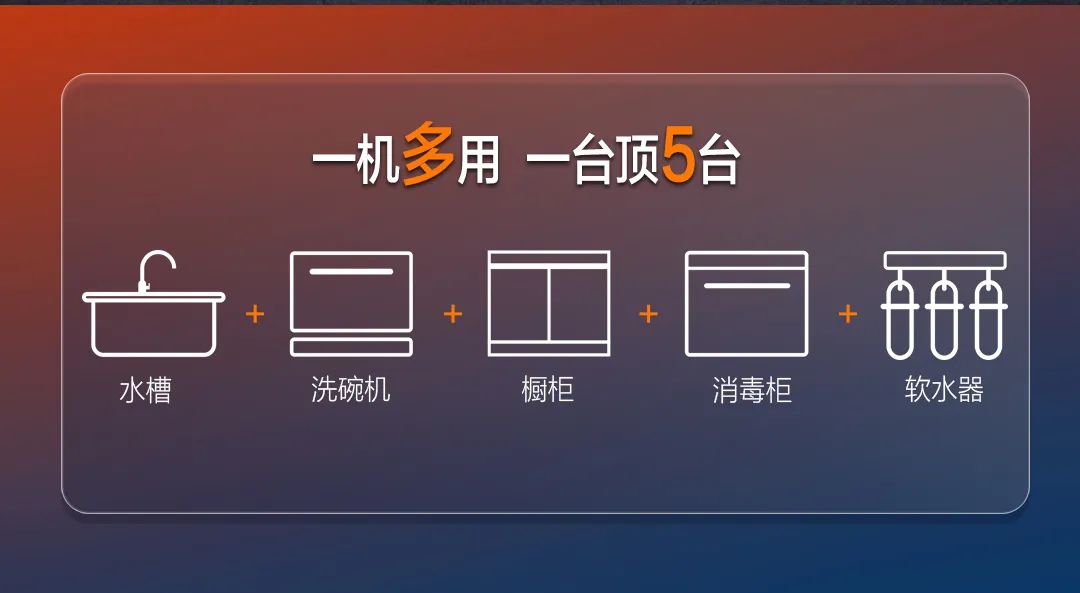 一臺(tái)集成水槽洗碗機(jī),相當(dāng)于:水槽+洗碗機(jī)+櫥柜+消毒柜+軟水機(jī)!一平方實(shí)現(xiàn)解放清洗自由,解放雙手就是現(xiàn)在!