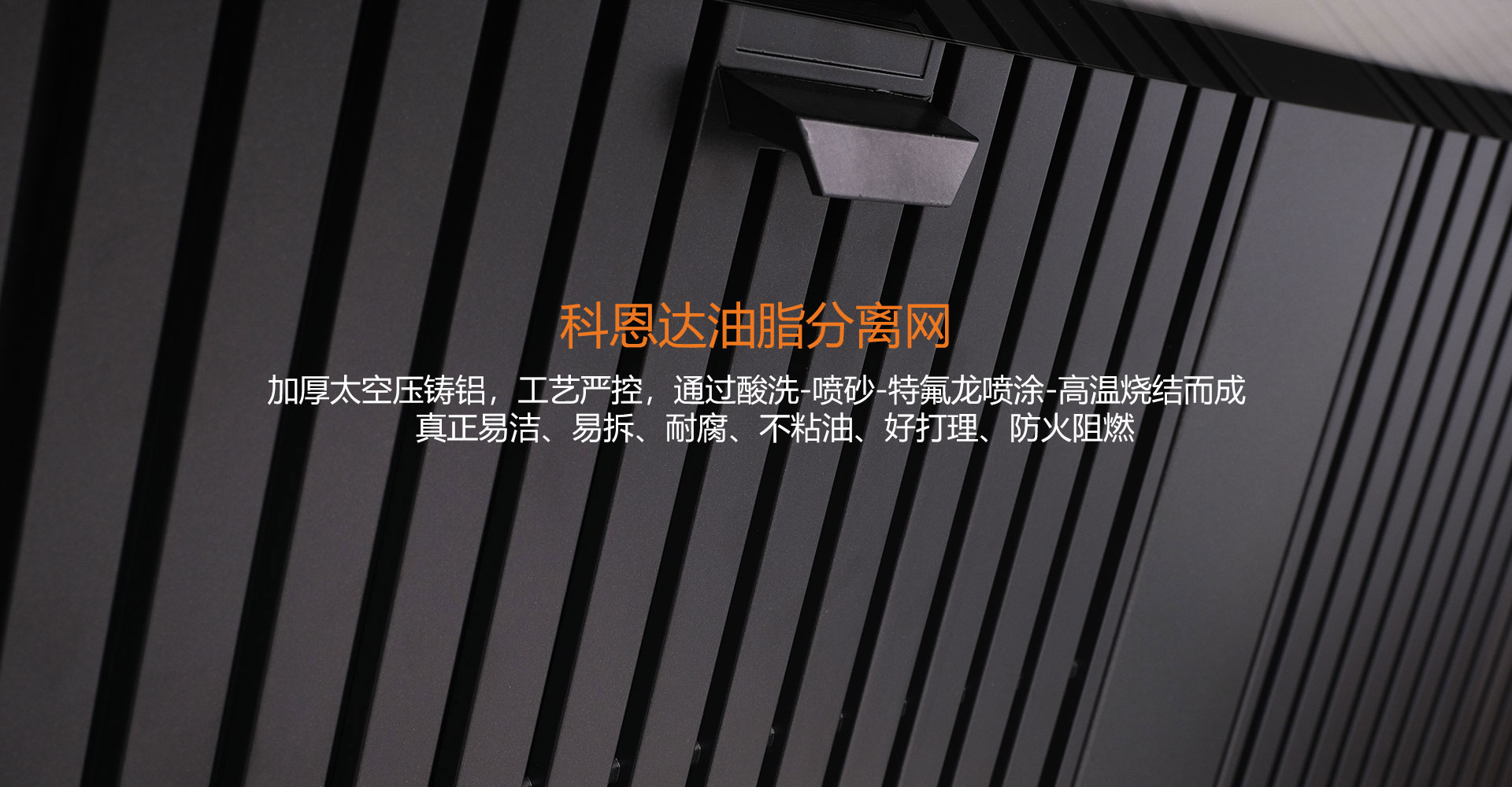 科恩達三層油脂分離網,加厚太空壓鑄鋁,工藝嚴控,通過酸洗-噴砂-特氟龍噴涂-高溫燒結而成真正易潔、易拆、耐腐、不粘油、好打理防火阻燃。