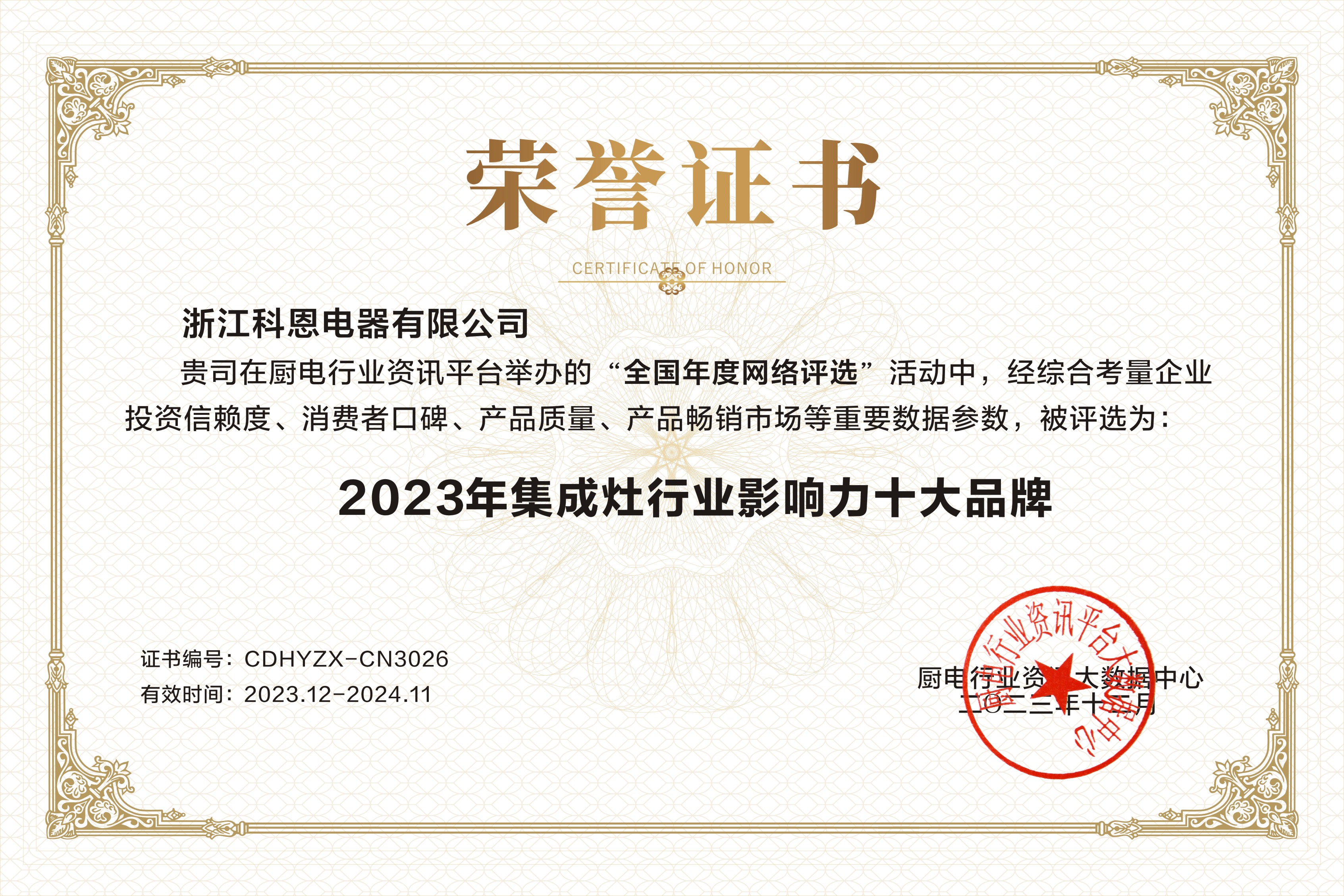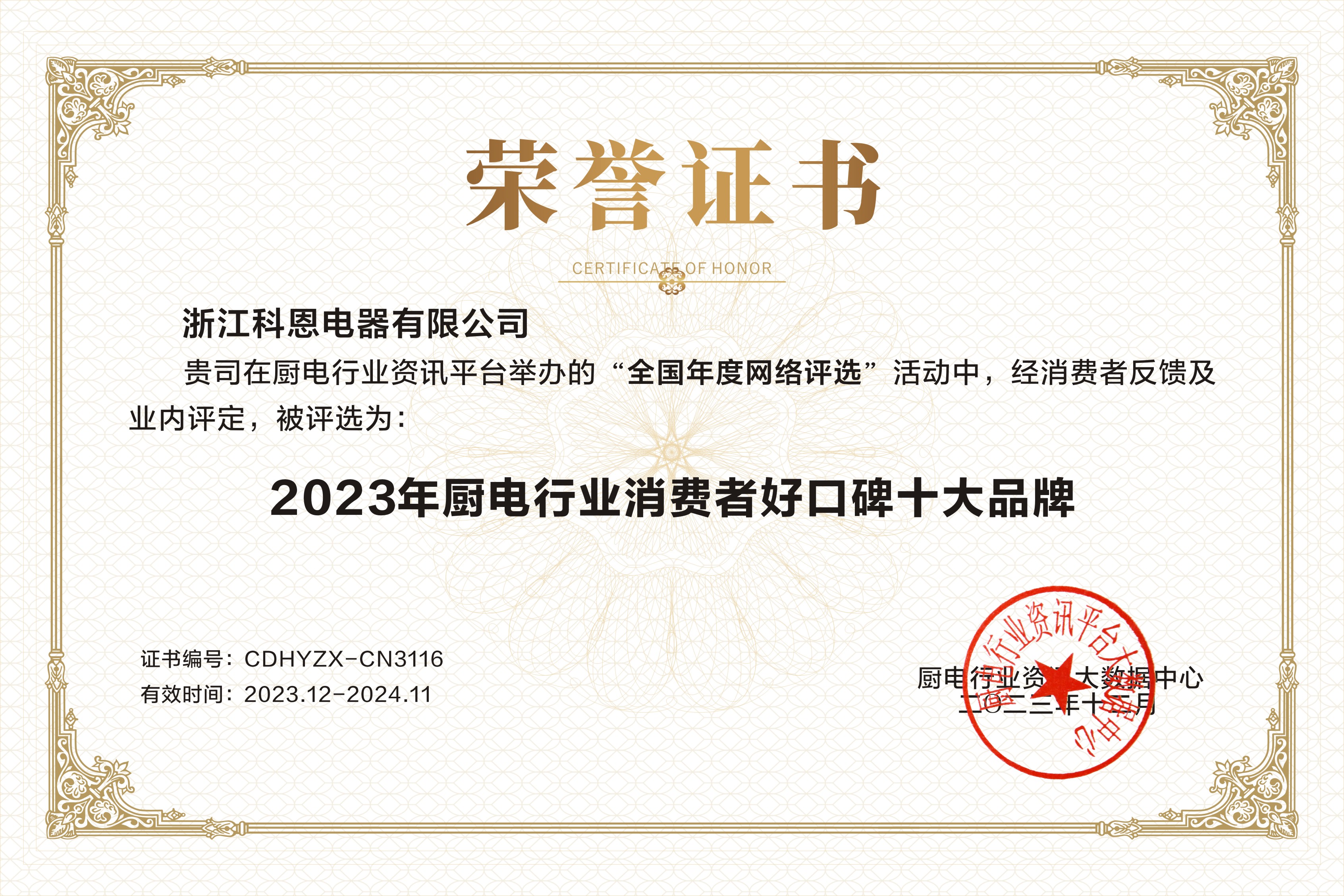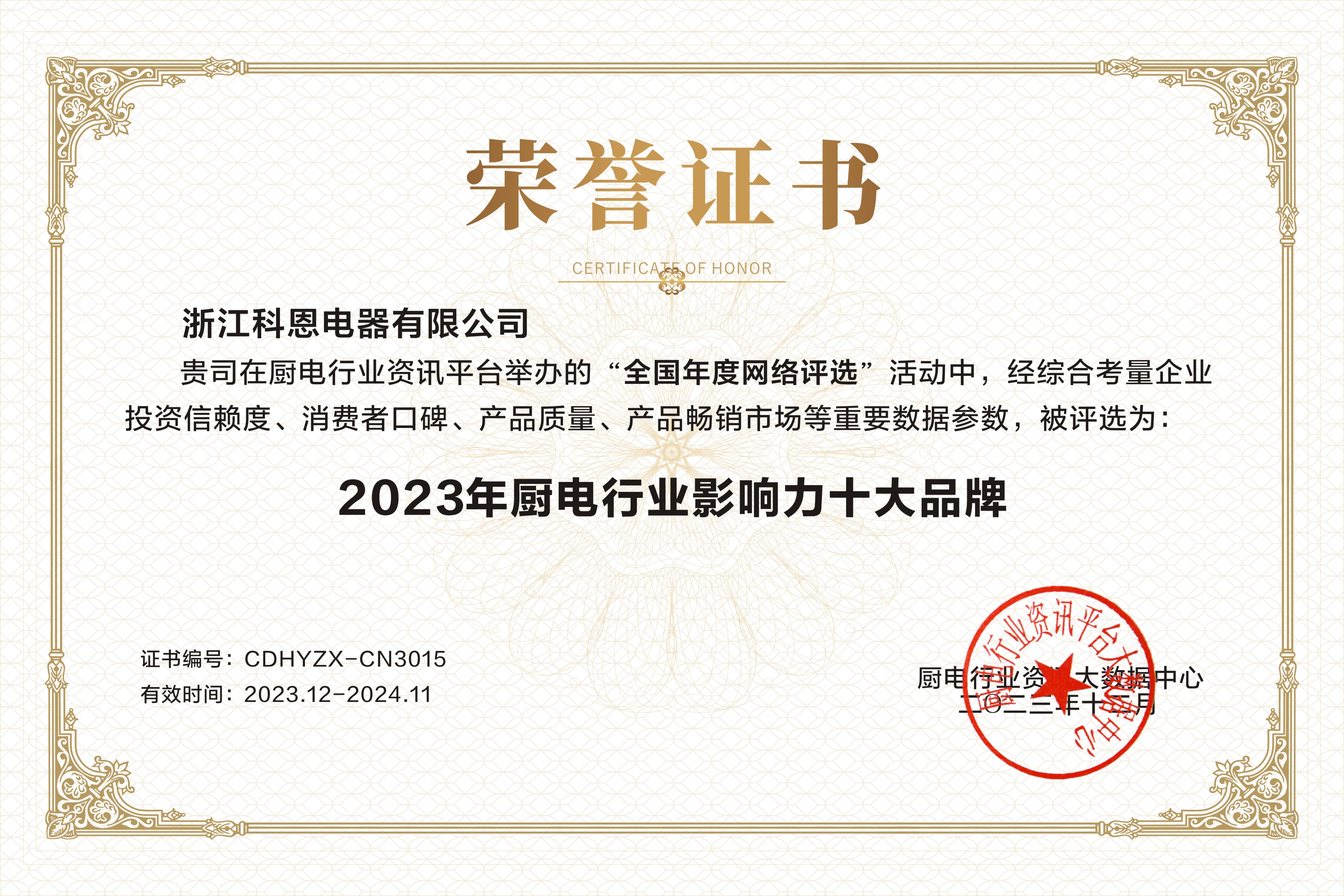匠心“灶”就精品,品質(zhì)見證實(shí)力!2023年,浙江科恩電器有限公司再次憑借實(shí)力連獲3獎(jiǎng)!