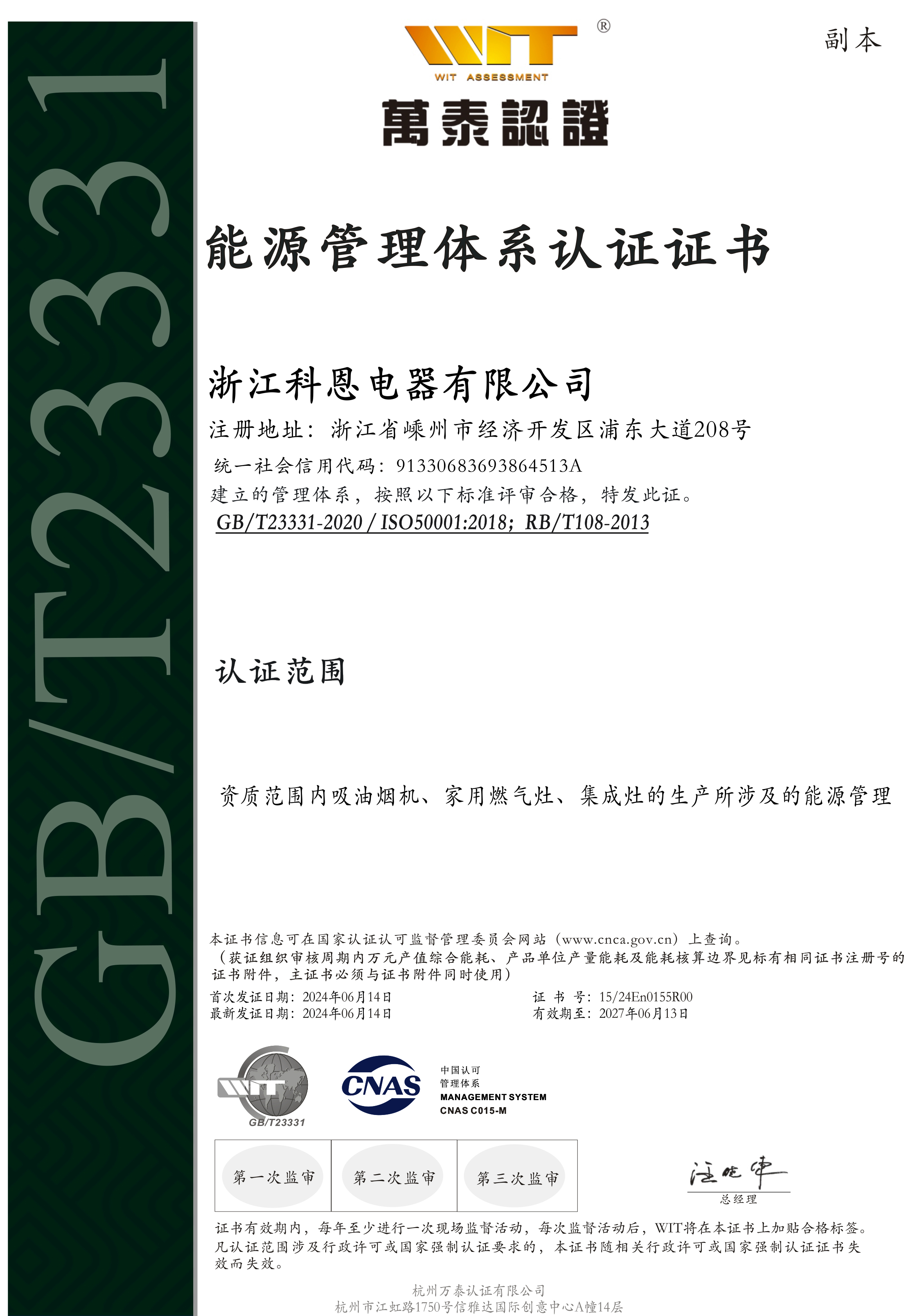 科恩公司順利通過ISO50001能源管理體系認證,代表著公司積極響應國家“3060”雙碳戰略,在節能低碳、高質量發展上邁向新征程,更是踐行國家“以舊換新·綠色家電”的又一生動實踐。