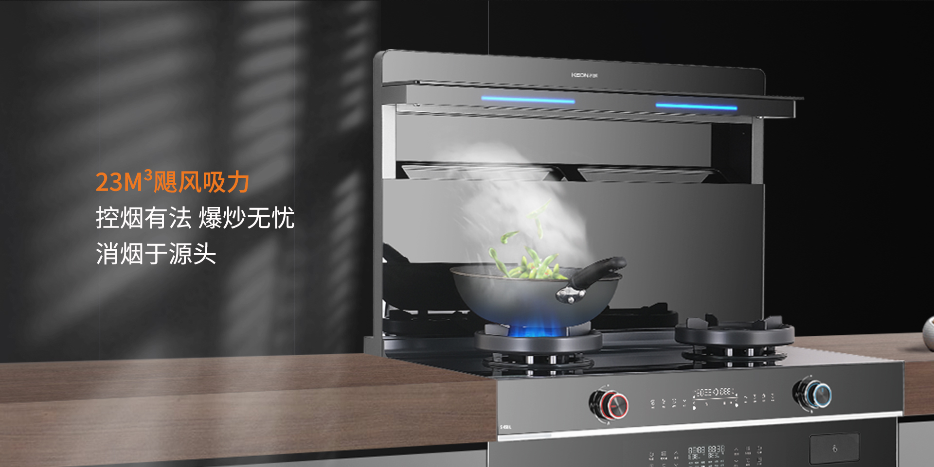 開啟烹飪從一聲你好,小科!開始。語音控制一呼即應,解放雙手,不同功能隨心可選,照明、風擋、時間等,開口即可操作。