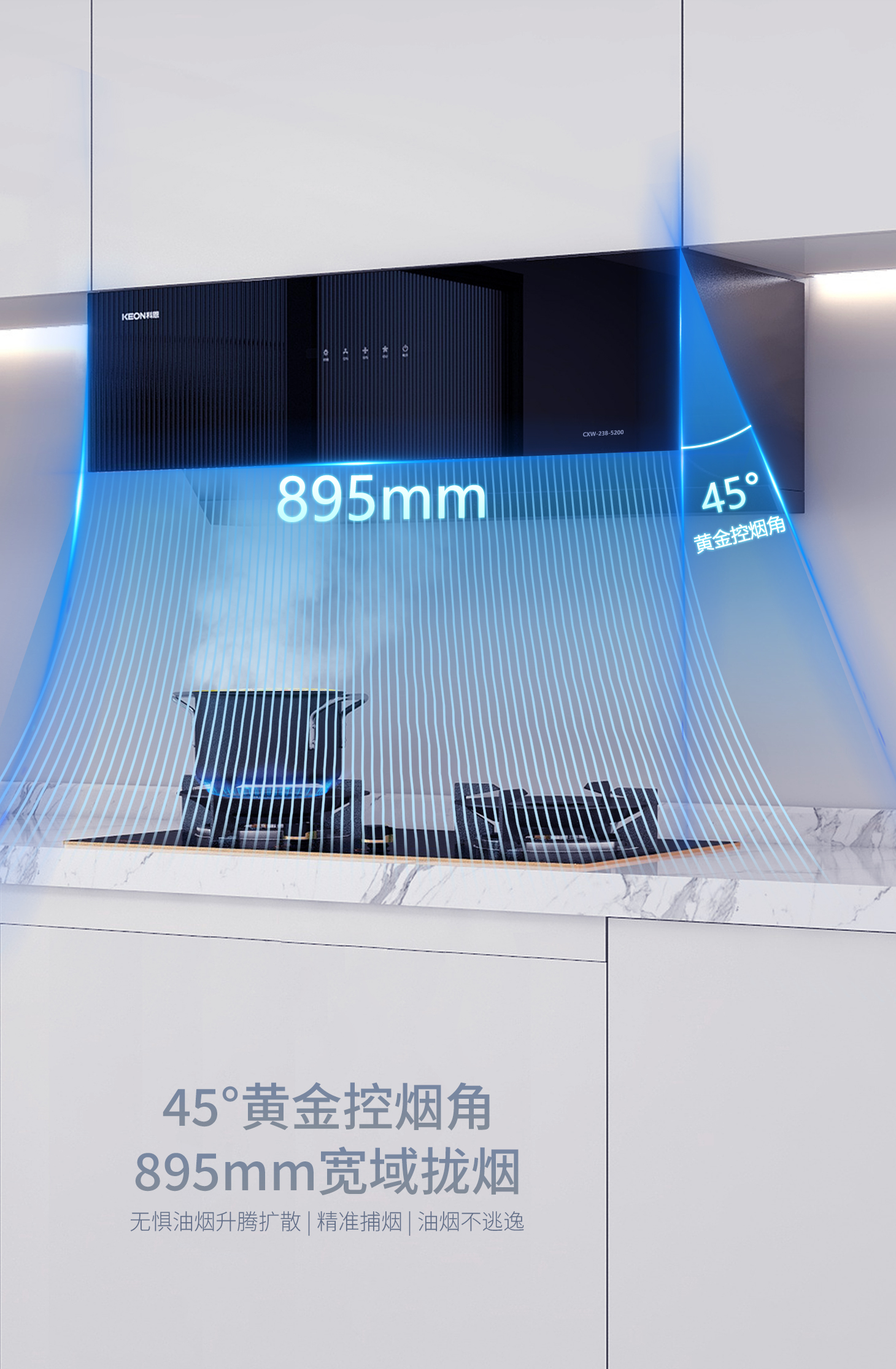 同時,5200特有的45°黃金吸煙角,輕松阻絕油煙上升可能,搭配23m³/min颶風吸力,徹底告別了油煙飄散的煩惱,輕松打造無煙廚房。