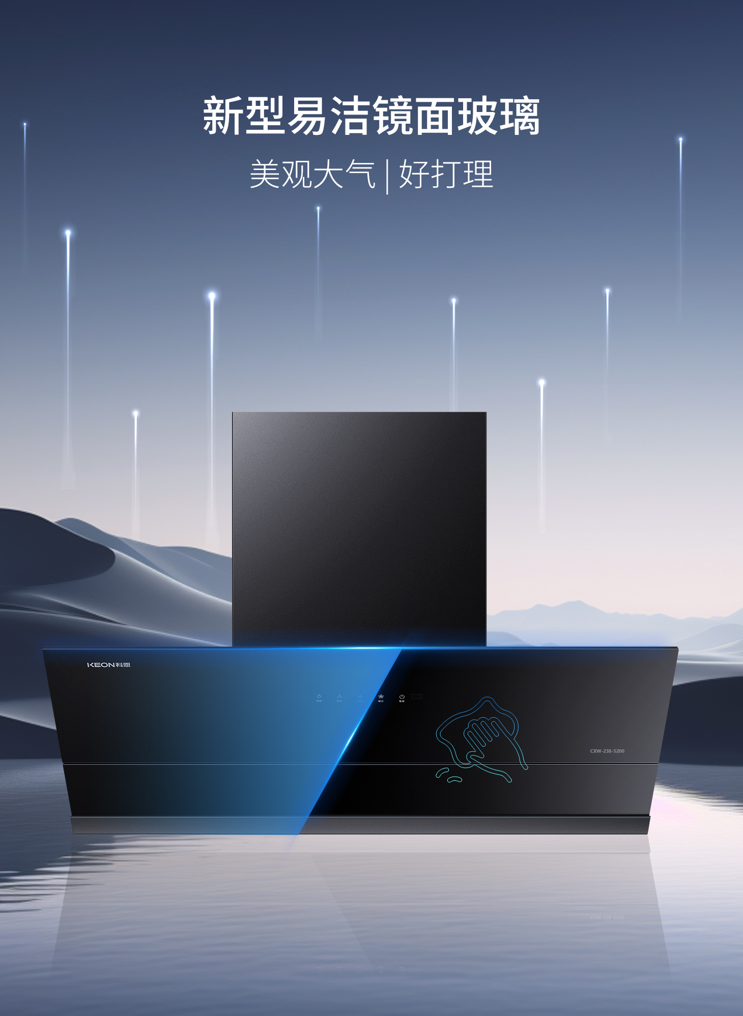 5200采用全新易潔鏡面玻璃材質美觀大方且便于清潔,產品35CM的超薄機身設計,可與吊柜齊平,避免了碰撞和遮擋視線的問題。