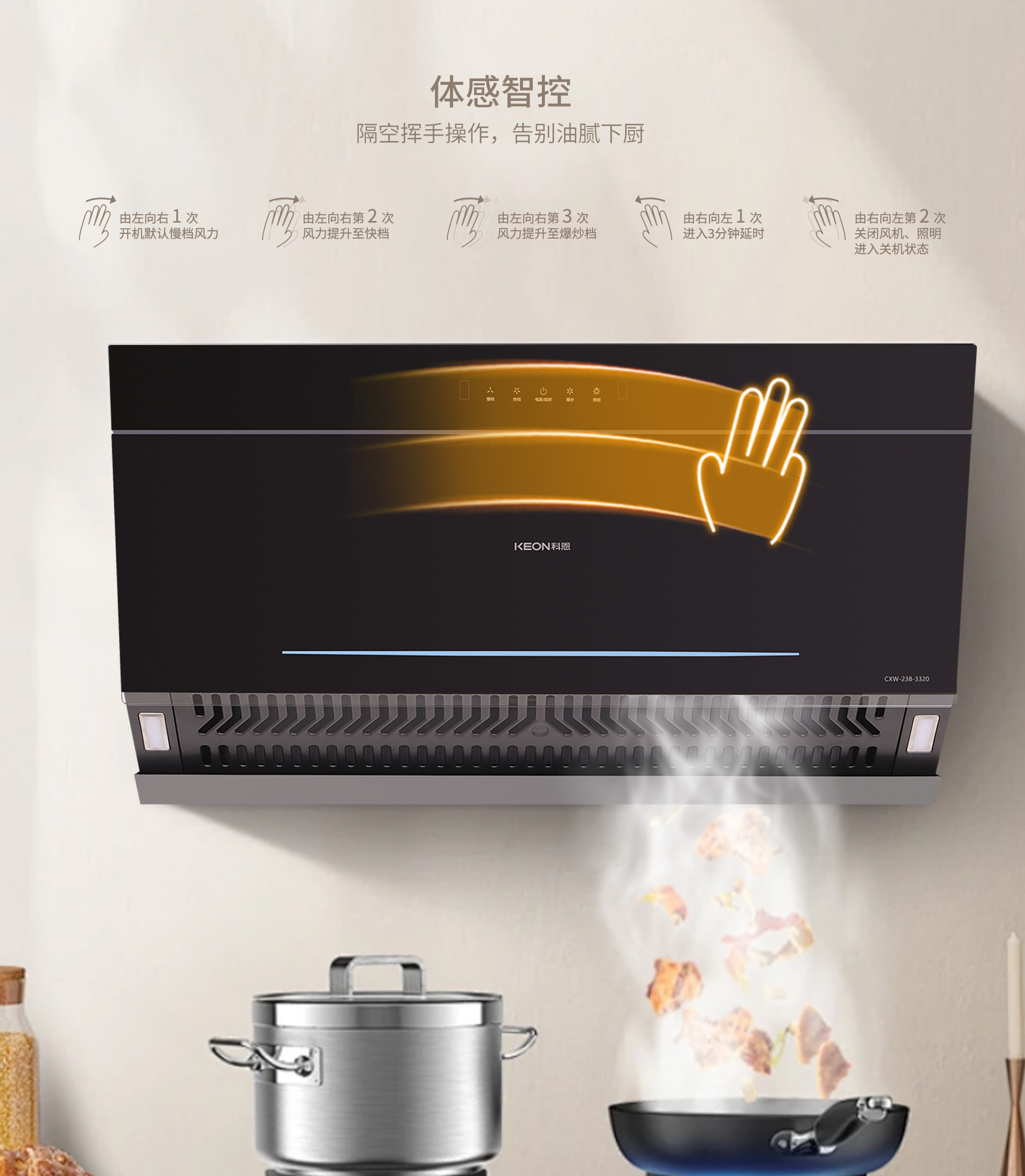 操作上的便捷性同樣不可或缺。隔空揮手操作讓使用者告別油膩下廚,無需觸碰煙機,通過揮手就能輕松控制開關、調節風速等功能,盡顯科技魅力。一線天星空藍氛圍燈設計為廚房增添時尚大氣之感,科技感十足。特氟龍工藝機身與易潔鋼化玻璃的組合,使得煙機清理變得輕而易舉,煙機清理從此不求人。