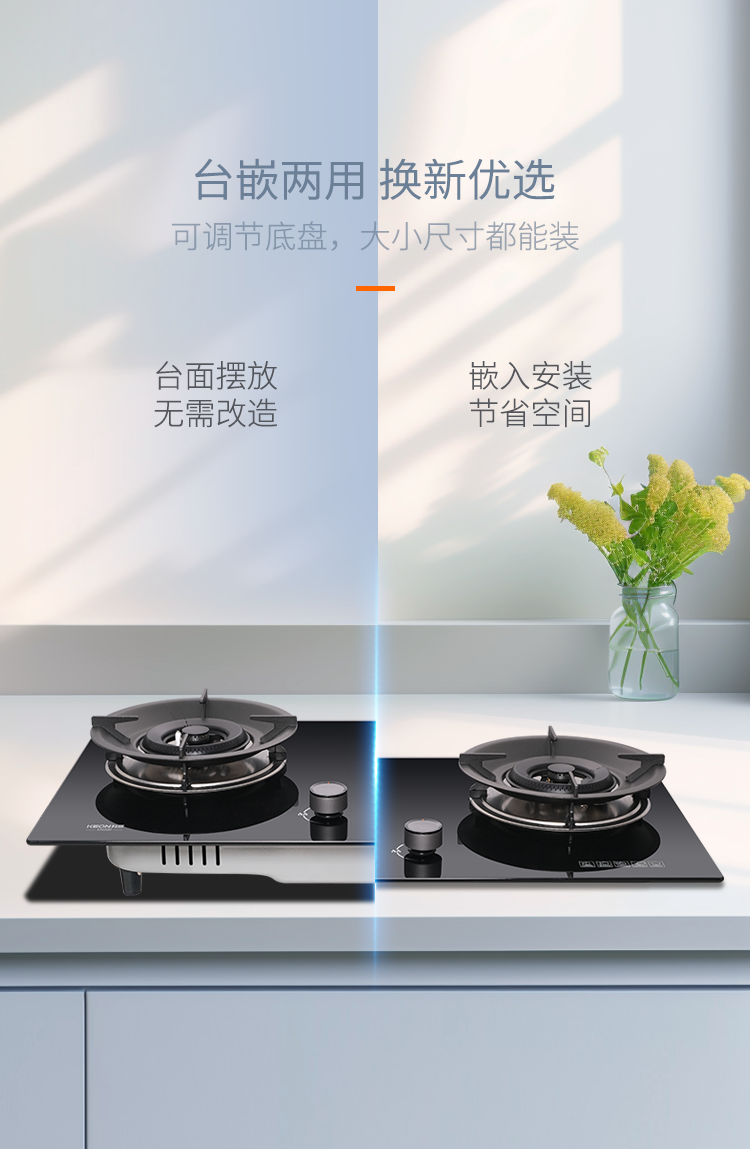 小灶大能,換裝無(wú)憂。自適應(yīng)底盤,換灶零門檻。不擴(kuò)孔不改孔,老廚房無(wú)縫升級(jí)。臺(tái)嵌兩用,換新優(yōu)選,意外熄火秒斷氣源,一級(jí)能效認(rèn)證,環(huán)保省錢雙贏,舊灶退役,新灶即刻上崗。黑晶美學(xué),格調(diào)新生。黑晶防爆鋼化玻璃面板,一抹即凈的優(yōu)雅,廚房秒變秀場(chǎng)。蜂巢矩陣不銹鋼湯盤,頑固污漬克星,全新筑巢方式點(diǎn)線嵌入,污漬無(wú)處遁形,清潔更輕松。