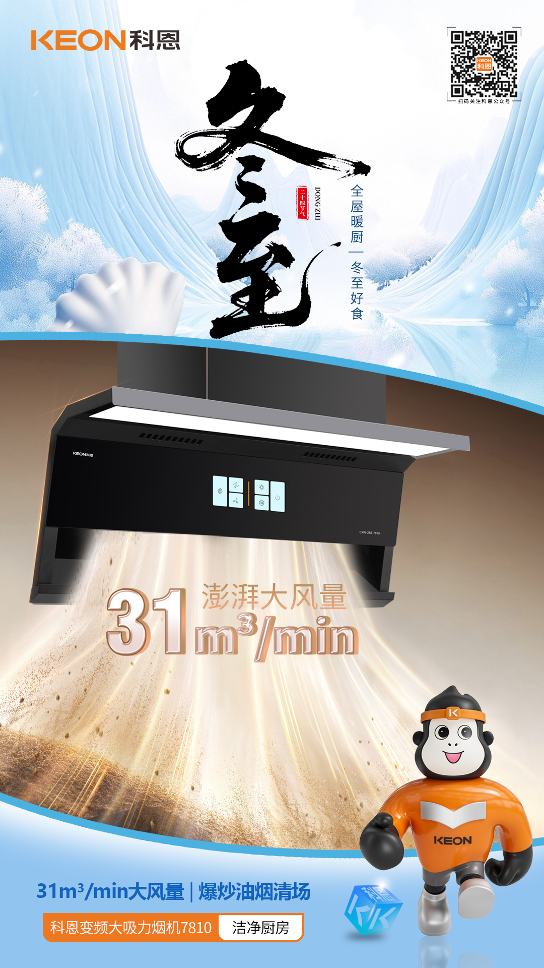 強吸凈煙,灶間清爽冬至爆炒,油煙肆虐科恩7810煙機就位,瞬鎖油煙31m³/min 澎湃風(fēng)量3秒清場功力天鵝頸設(shè)計,釋放操作空間揮手智控啟停,告別油膩觸碰全域攏煙,讓烹飪回歸優(yōu)雅纖薄高顏,智洗省心冰川灰鑲邊,適配各式廚裝特氟龍涂層,油污一擦即凈搭載智旋自清潔,持久強勁吸力全景護眼大燈,烹飪視野明朗延時排煙設(shè)計,余味一掃而空老廚煥新,無需大動干戈