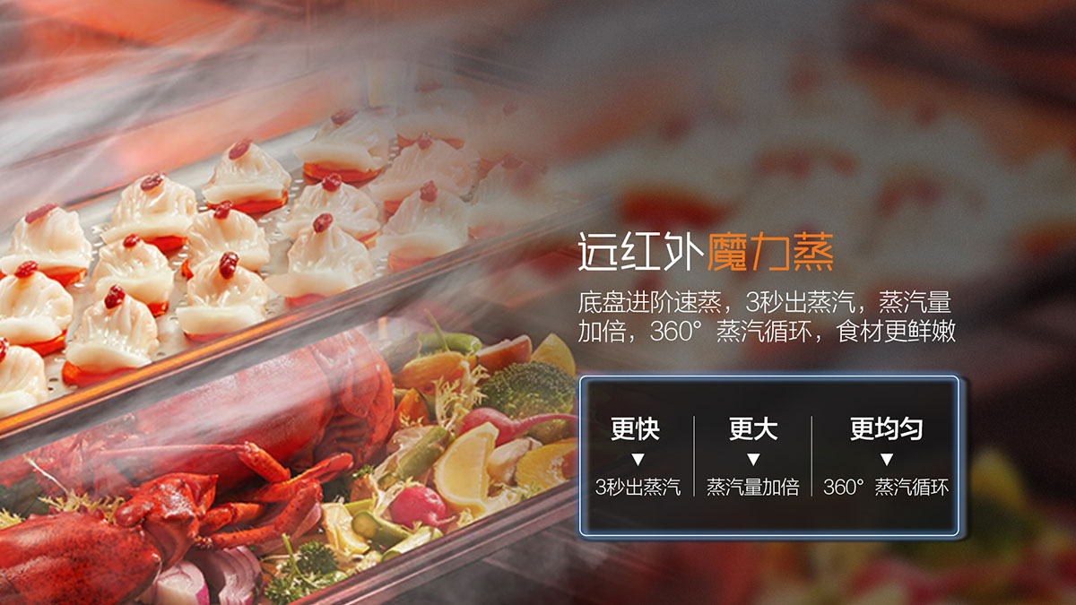 - 遠紅外魔力蒸,底盤進階速蒸,360°蒸汽循環(huán),3秒出蒸汽,鎖鮮食材