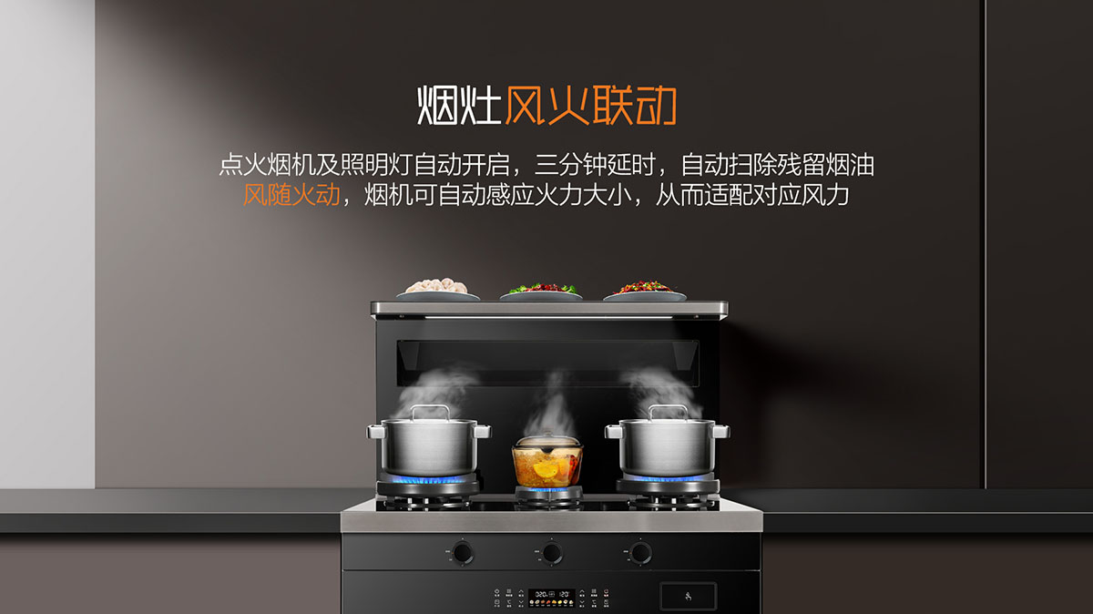 - 煙灶風火聯(lián)動,點火煙機自動開啟,風量隨火力大小自動調節(jié)